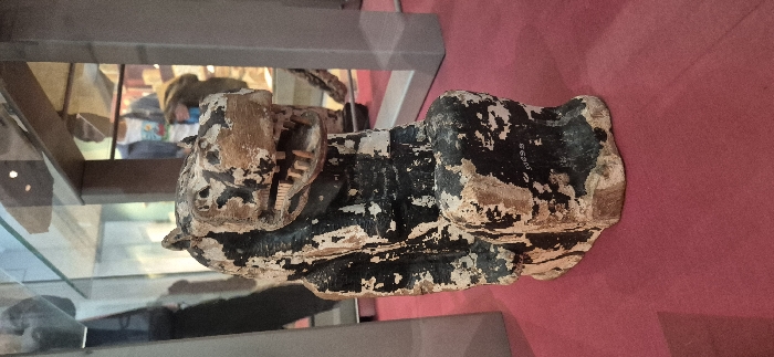 - "A weathered, dark-colored carved figure, possibly of wood or similar organic material, depicting an animalistic or anthropomorphic creature in a seated position, is displayed centrally" by FM-FeWFt2, licensed under CC BY 4.0