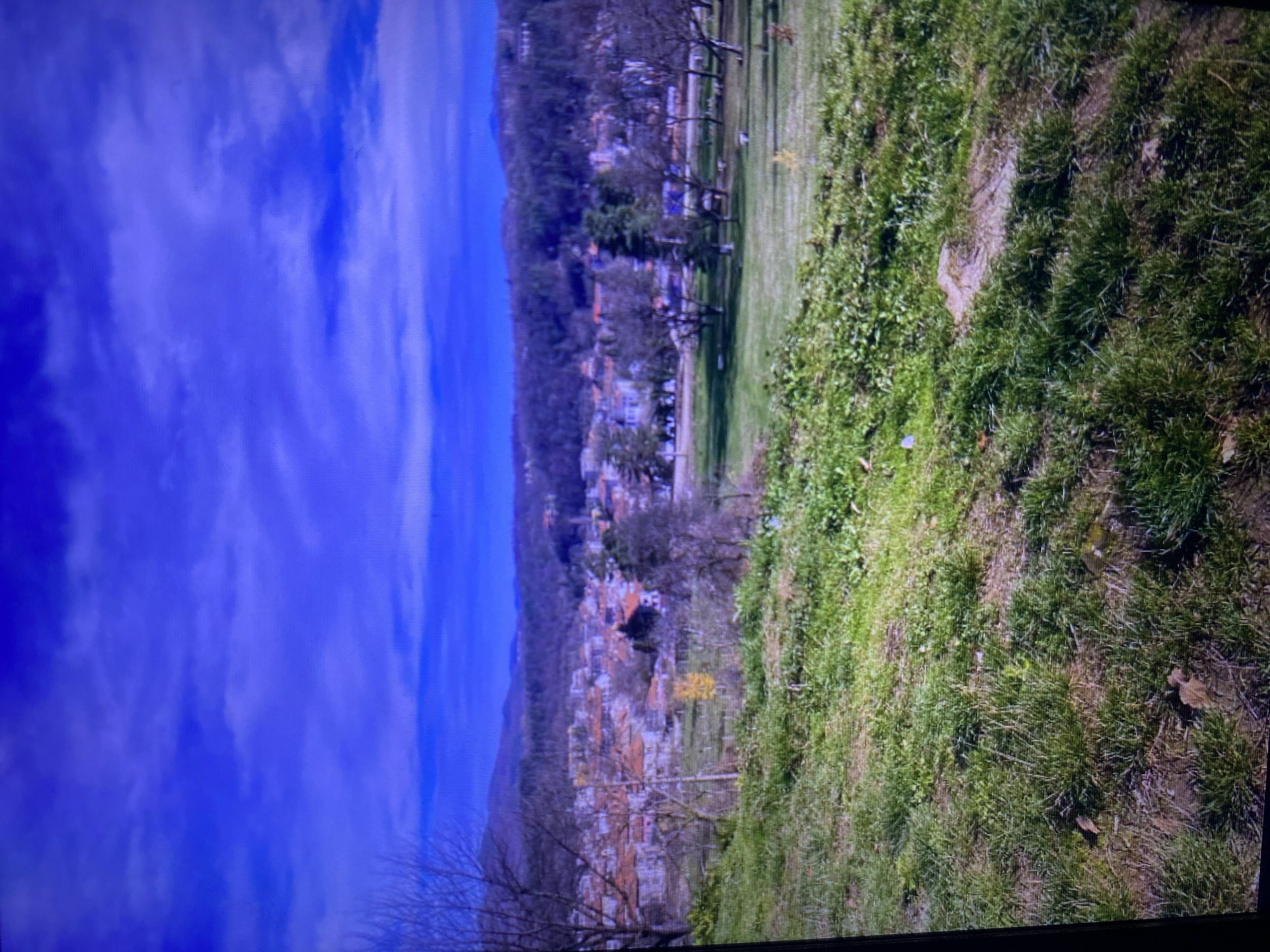 The image displays a daytime panoramic landscape of Cherni Osam, Bulgaria, under a bright blue sky with scattered white cirrus clouds. The lower foreground is composed of green, somewhat unkempt grass, interspersed with patches of dry brown vegetation and visible earth, suggesting a worn path or sparse growth. In the midground, a village is visible, characterized by multiple buildings featuring reddish-brown tiled roofs, nestled among a density of mostly bare deciduous trees, indicating late autumn, winter, or early spring. One tree within the village exhibits bright yellow foliage. To the left horizon, a significant body of calm blue water extends, bordered by distant forested hills or mountains. No individuals, specific actions, or interactions are discernible within the frame.