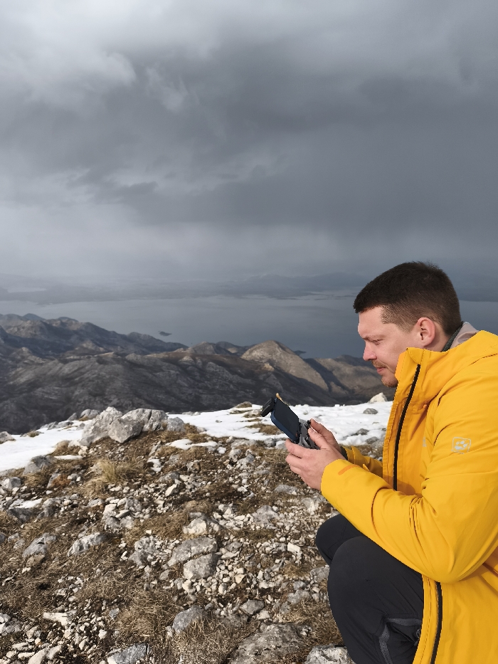 A male subject, estimated mid-30s to early 40s, is observed crouching on a rocky, snow-dusted mountain summit in Mali Mikulići, Montenegro. He is wearing a yellow outdoor jacket with black accents and dark trousers. The subject holds a dark-colored smartphone, mounted to a drone controller, with both hands, focusing his attention on the device's screen. The background reveals a panorama of barren mountains descending towards a large body of water, partially obscured by atmospheric haze beneath a heavily overcast and dark grey sky.