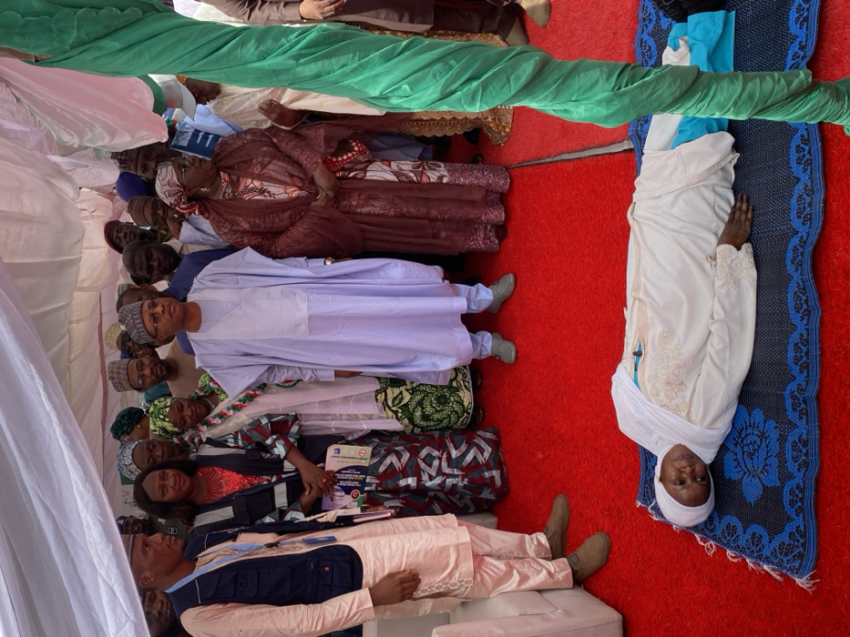 The image captures a public gathering under a white canopy with a red carpeted ground. In the foreground, a woman lies supine on a blue and white patterned mat. She wears a white long-sleeved garment with faint embroidery and a white headscarf (hijab); her eyes are open. In the midground, approximately fifteen individuals are standing and observing the woman. Prominently positioned center-right is former Governor Nasir El-Rufai, dressed in a light purple traditional Nigerian agbada and cap, wearing glasses, and looking towards the woman on the ground. To his left stands a woman in a dark red patterned dress and matching headscarf, holding a small patterned clutch bag. To the far left, a man in a light beige traditional outfit and a dark blue utility vest with a light blue lanyard is visible. Other individuals in the standing group are dressed in various traditional attire. A green fabric-wrapped pole is visible on the right side of the frame. The scene is located in Kaduna City, Kaduna State, Nigeria.