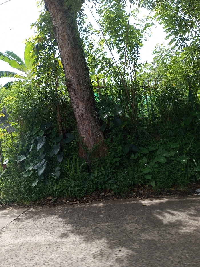 The image depicts an outdoor scene in Kandenuwara, Sri Lanka, characterized by dense vegetation adjacent to a paved surface. A prominent, thick-barked tree trunk occupies the mid-left portion of the frame, rising from a densely vegetated embankment. The embankment consists of various green plants, including large broad-leafed species, smaller leafy bushes, and ground cover. In the background, a rudimentary fence constructed from vertical wooden or bamboo poles is partially visible amidst the foliage, with hints of a green net or tarp behind it. The paved surface, likely a road or pathway, occupies the lower third of the image, exhibiting cracks and debris. Dappled sunlight casts shadows across the paved area, indicating daytime conditions. No individuals or animals are present in the scene.