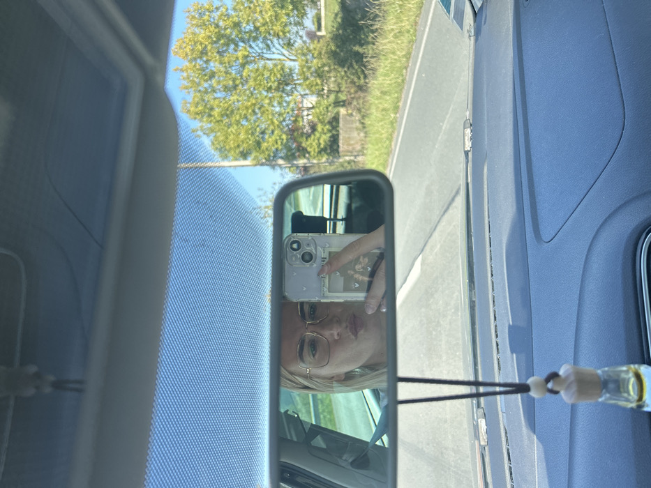 This image depicts a self-portrait taken from the driver's perspective inside a vehicle, reflected in the rearview mirror