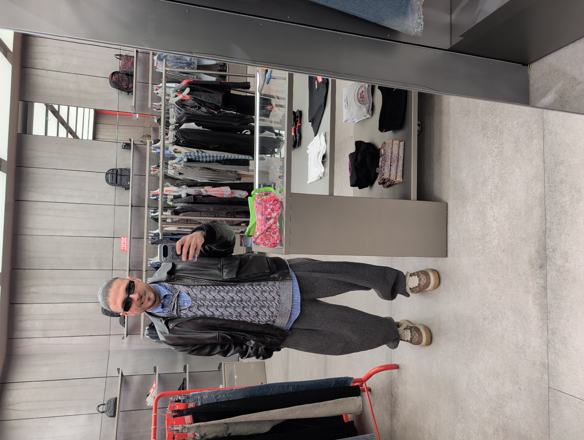 A man stands in a store, seemingly a clothing store, as suggested by the clothing racks and shelves of apparel in the background. He appears to be taking a photo of himself in a mirror, holding a smartphone up and displaying the screen. He is wearing sunglasses, a black leather jacket, a patterned vest over a light-blue collared shirt, and baggy grey trousers. The floor of the store is light grey and tiled. The walls are metallic and reflective, reflecting parts of the clothing displays. A red clothing rack with denim jeans is visible at the bottom of the frame. While the location cannot be verified without additional context, the instructions state that the hypothetical location of this photo is in the city of Sofia, Bulgaria.