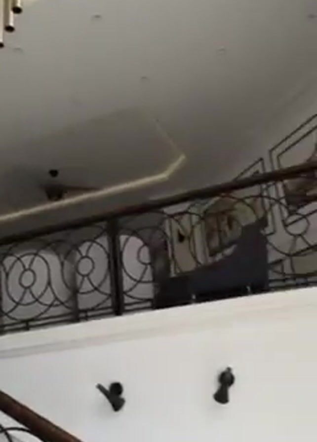 luxury interior with a modern chandelier hanging from the ceiling. It then moves to an outdoor view through a glass window, showing greenery and a building exterior. The camera then pans to a pathway over water, leading to a miniature Eiffel Tower replica surrounded by residential buildings.