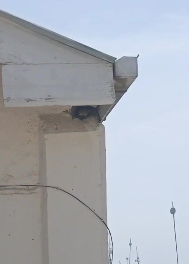 n exterior corner of a building against a sky that is a light shade of blue. A section of white roof overhangs the wall. A dark opening is visible beneath the roof section, revealing a dark, unidentifiable shape within. A black electrical cable runs down the side of the wall. In the background, a low cityscape is visible with various antennas and structures. The overall composition is a medium shot focused on the architectural details of the building.