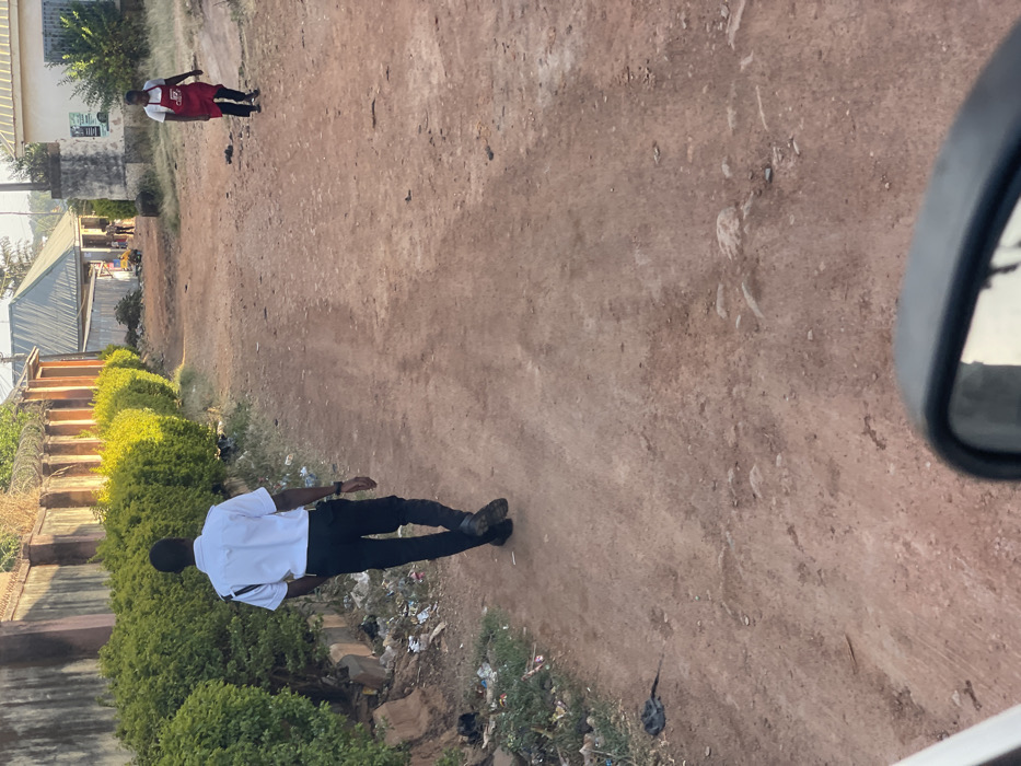 The image depicts an unpaved, reddish-brown dirt road in Barakin Lerawi, Nigeria, under natural daylight conditions. Two individuals are visible walking on the road. In the midground, a male figure is seen from behind, walking away from the camera toward the distant background. He wears a short-sleeved white collared shirt and dark trousers. Along the left side of the road, a concrete wall topped with coiled barbed wire runs parallel to the path, fronted by a row of neatly trimmed green bushes. Accumulations of litter and debris are visible at the base of the bushes. Further down the road, toward the right, a second individual walks towards the camera, wearing a white top and a prominent red apron over dark trousers. In the background, several single-story buildings with metallic roofs are visible, indicating a built-up area. A partial view of a vehicle's side-view mirror is present in the bottom right corner of the foreground.