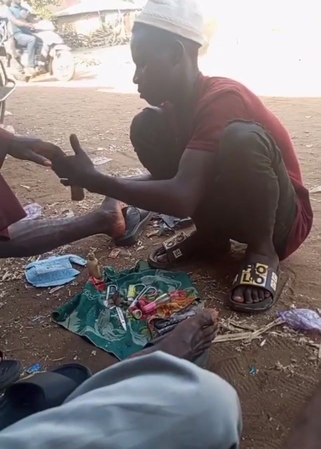 A man is squatting in the dirt, attending to another man's hand. The man squatting is wearing a red shirt, black pants, black and gold sandals, and a white kufi cap. In front of him on a green cloth are tools, including scissors, thread, and other small items. The man whose hand is being attended to is seated, with his bare foot visible. A third person's legs, clad in grey sweatpants and black sandals, are also visible in the foreground. The scene takes place outdoors on a dirt surface with some trash scattered around. There is a building in the background and people walking by. The overall impression is one of a makeshift outdoor workspace, possibly a street barber or repair setup.