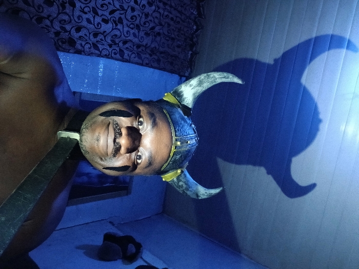 The image captures a dark-skinned adult individual positioned centrally, directly facing the camera with a slight smile, located indoors in Mmumoshweu, Botswana. The individual wears a dark, horned helmet with gold-colored accents and a dark collar around the neck, from which a wide, dark strap extends diagonally across the right shoulder. Two vertical black marks are painted on each cheek. The upper torso appears bare. A distinct shadow of the horned helmet is cast on the light-colored, horizontally striated ceiling above the individual's head. The scene is predominantly lit by a strong blue light source. To the left, a dark patterned fabric is visible, while the right background consists of a light blue wall displaying an indistinct dark object and a darker, rectangular opening.
