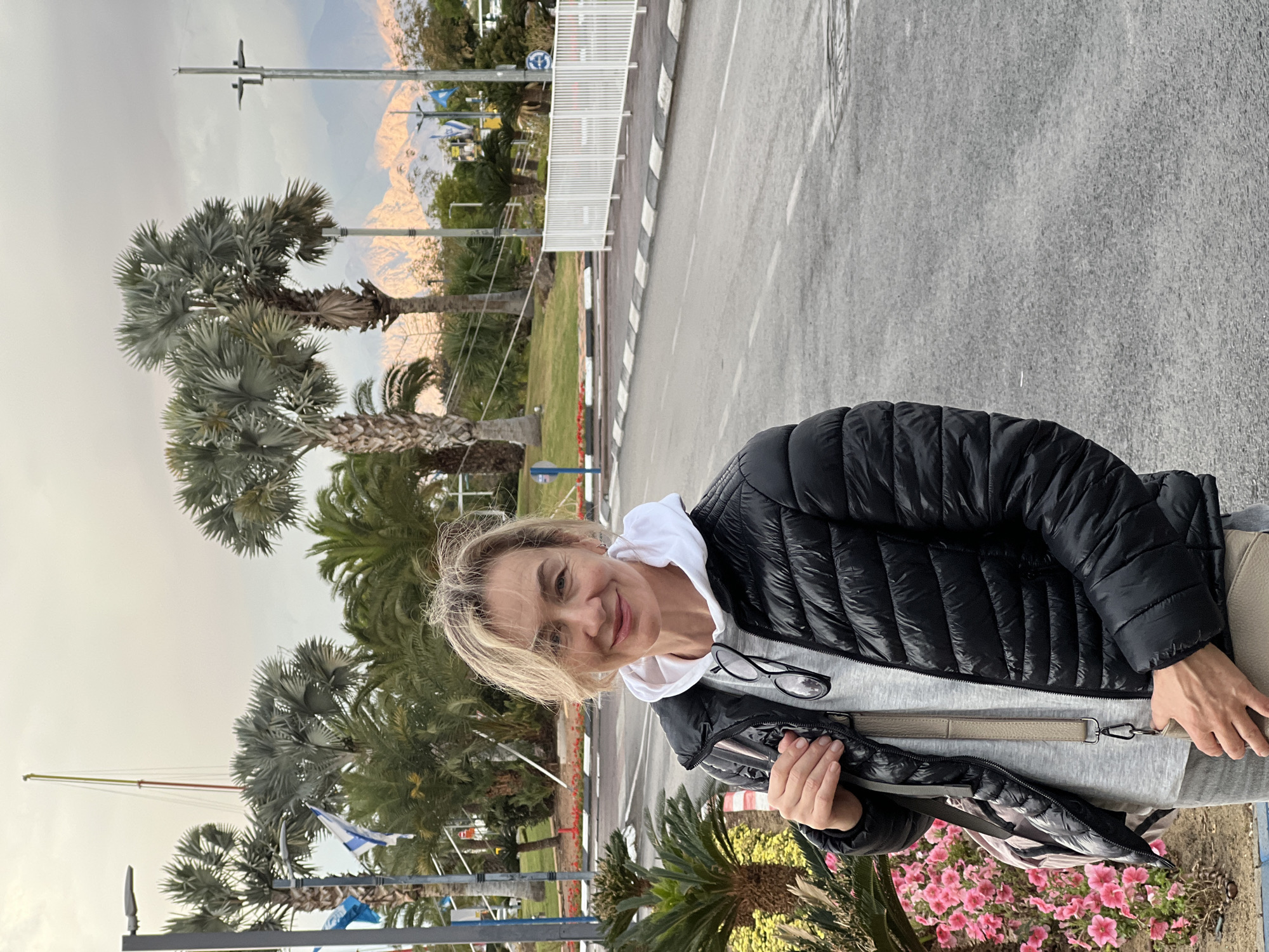 The image displays a blonde-haired woman standing on a paved street in Eilat, Israel. She is positioned slightly to the left of the frame, smiling subtly at the camera. She wears a black puffer jacket over a light grey hooded sweatshirt and a grey t-shirt. Black-framed eyeglasses are suspended from a lanyard around her neck. She carries a light beige crossbody bag and holds a darker item in her right hand. To her immediate left, pink flowering plants and green foliage are visible, bordered by a black and white striped curb. The foreground features a grey asphalt road with dashed white lane markings. A white vertical slatted fence parallels the road further right. The mid-ground reveals a landscaped median with green grass, red flowers, and various palm trees, including tall silver bismarckia palms. Streetlights are present throughout this area. A tall, slender mast, possibly a sailboat mast, extends into the overcast sky on the far left. An Israeli flag is visible on a pole amidst other flags. In the distant background, rugged mountains, characteristic of the Eilat region, are illuminated with a warm, orange hue, suggesting late afternoon or early morning light. The sky is cloudy with varying shades of grey and white.