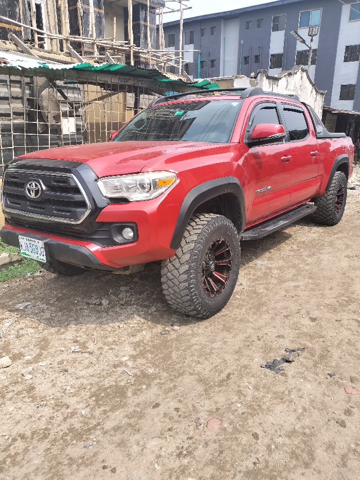 - "A red Toyota Tacoma double cab pickup truck, model year approximately 2016-2023, is parked outdoors on an unpaved, dusty, light brown dirt and gravel surface in Alaiyabiagba, Nigeria" by FM-pLBwv1, licensed under CC BY 4.0
