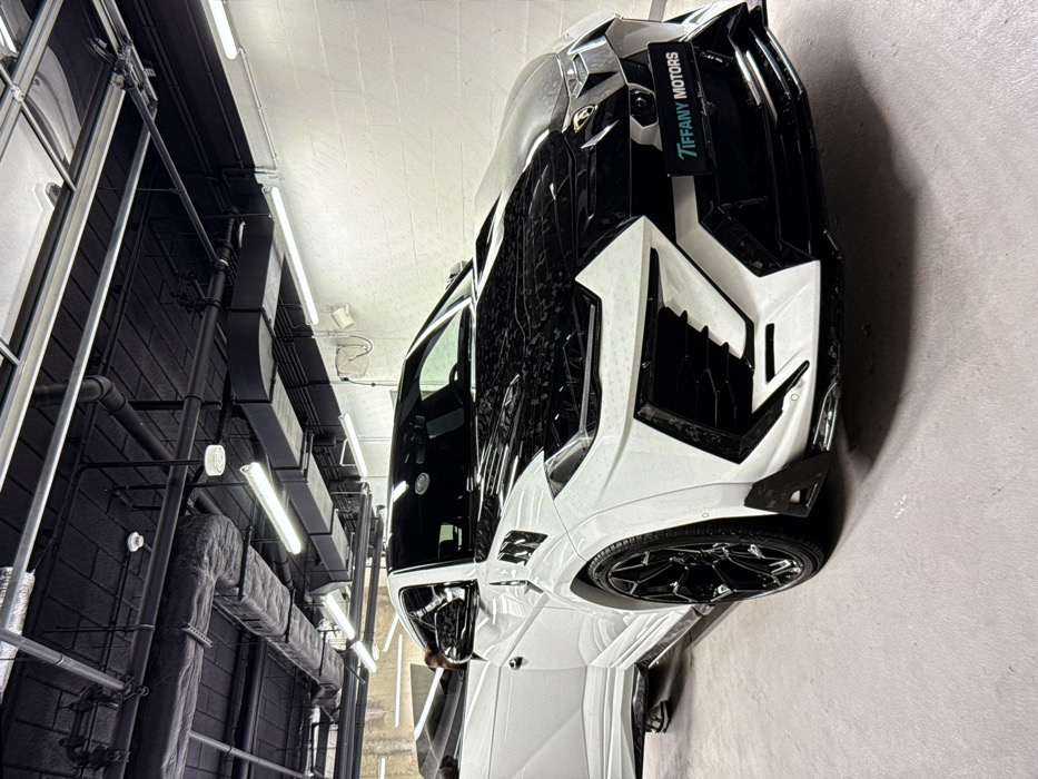 A white and black Lamborghini, adorned with "Tiffany Motors" branding, stands in a garage