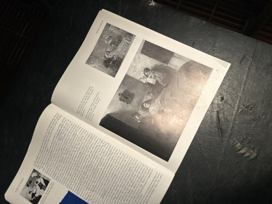 - "The book page displays two black and white images, one labeled "Agitated Picasso, Sketch for Science and Charity, 1897," and the other, "Junior Picasso, Science and Charity, 1897" by FM-JqEJc2, licensed under CC BY 4.0