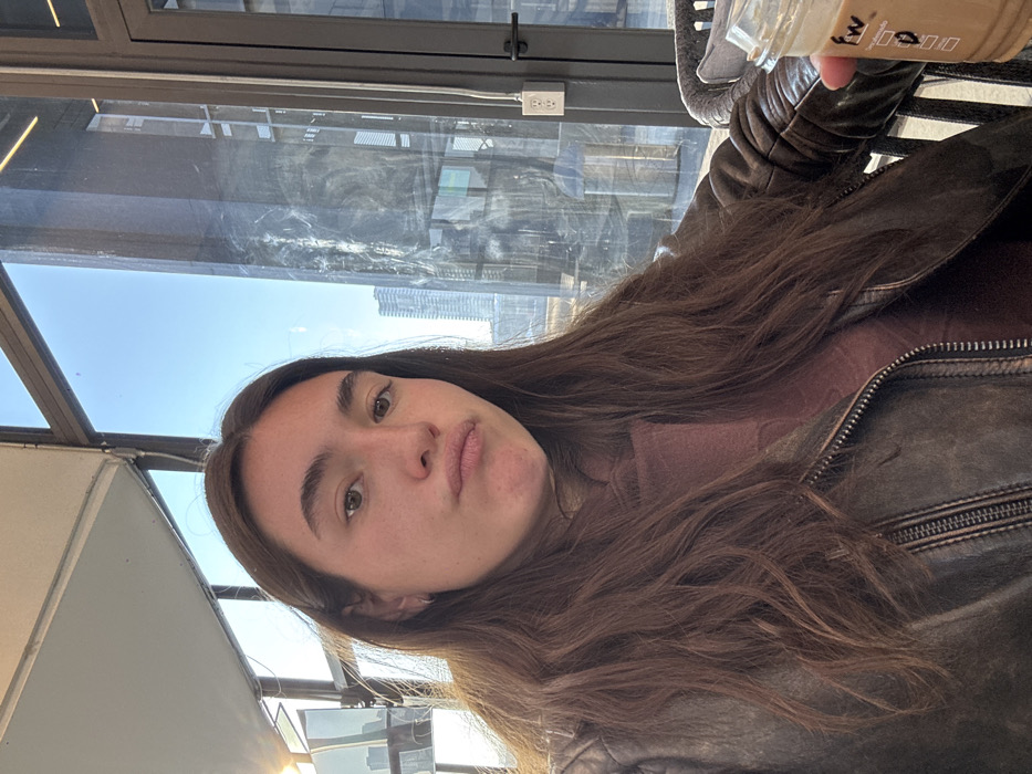 A young adult female with long, dark brown, wavy hair is depicted in a close-up selfie, posing with pouted lips and direct eye contact with the camera. She wears a dark brown, distressed-look leather jacket over a reddish-brown top. Her right hand holds a clear plastic cup containing an iced beverage with a lid and straw, featuring a "FW" logo. The background consists of a large window revealing a clear blue sky and an urban skyline, including a prominent dark, reflective skyscraper. Sunlight illuminates the scene from the left. A white dual electrical outlet is visible on a vertical architectural element beside the window on the right. A dark, woven chair is partially visible on the far right. The scene is an indoor setting overlooking an urban environment in Unknown, Unknown.