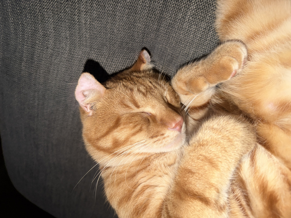 - "An orange tabby cat is sleeping peacefully on a gray surface, likely a couch" by FM-FHe0a2, licensed under CC BY 4.0