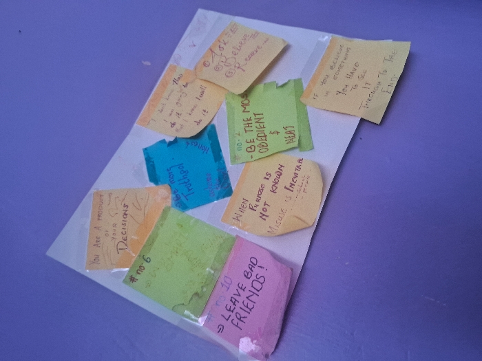 - "The image displays a flat lay of nine handwritten sticky notes of various colors arranged on a white sheet, which is affixed to a solid light purple background, located in Ongata Rongai, Kenya" by FM-UrRWw2, licensed under CC BY 4.0