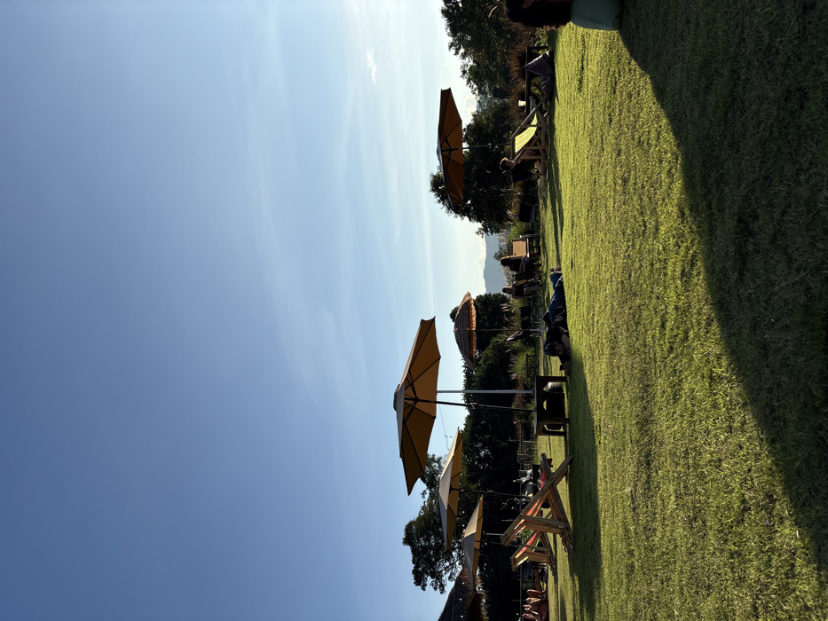 This image captures an outdoor leisure area within Ban Mae Ping, Thailand. The scene is dominated by a neatly manicured green grass lawn, illuminated by late afternoon sunlight which casts elongated shadows. The sky overhead is clear and blue with minimal, faint cloud streaks. Several large, beige or tan-colored patio umbrellas are deployed across the lawn, providing shade. In the central mid-ground, one individual is lying prone on the grass, wearing dark clothing, positioned near a small, dark-stained wooden coffee table. To their immediate left, two empty wooden-framed lounge chairs with light-colored fabric seats are angled. Further back, approximately eight other individuals are visible, mostly seated in additional lounge chairs or on benches, dispersed throughout the grassy area, generally appearing in relaxed postures. A light blue beanbag chair is partially visible in the far right foreground. The background consists of dense green foliage from trees and distant mountains or hills under a bright horizon line. A partial thatched-roof structure and visible string lights are present on the far left of the scene. The overall environment suggests a recreational or relaxation setting.
