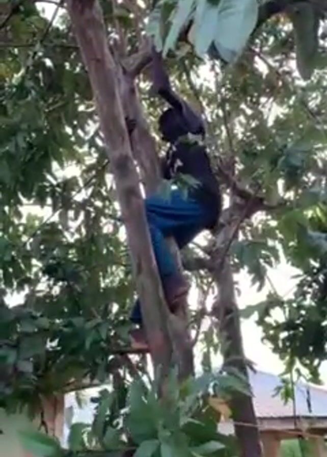 A person is climbing a tree in a yard. The person is wearing blue pants and a dark shirt. The tree has green leaves and a thick trunk. In the background, there is a building.
