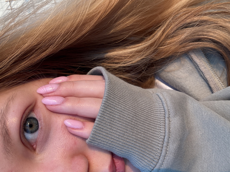 The image presents a close-up, cropped view of an individual's face and hand. The subject's left eye, featuring a blue-green iris and dilated pupil, is visible on the upper left. A section of the nose and upper lip are also discernable. A right hand is positioned against the lower cheek and mouth area. The fingernails are almond-shaped and coated in a light pink glitter polish; a subtle linear design is present on one nail. The individual wears a light gray-green ribbed cuff, consistent with a sweatshirt or hoodie. Long, wavy, light brown hair is visible on the right side of the frame, strongly illuminated by warm, natural light. The background is out of focus and undifferentiated, providing no discernible environmental details or specific location within Herzliya, Israel.