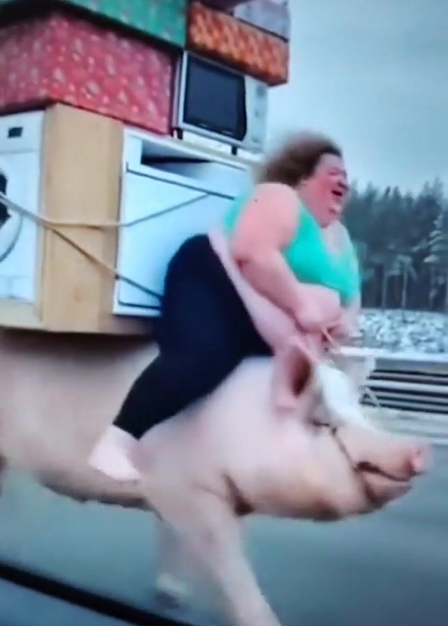 In this video, a heavy-set woman wearing a teal top and black pants rides on the back of a large pig along a road. The pig is laden with boxes, what appears to be a microwave, and a washing machine, all secured with rope. The woman appears to be yelling and laughing. The video is shot from the inside of a car, looking out the window. Other cars are visible in the background, as well as trees along the roadside. The sky is overcast.
