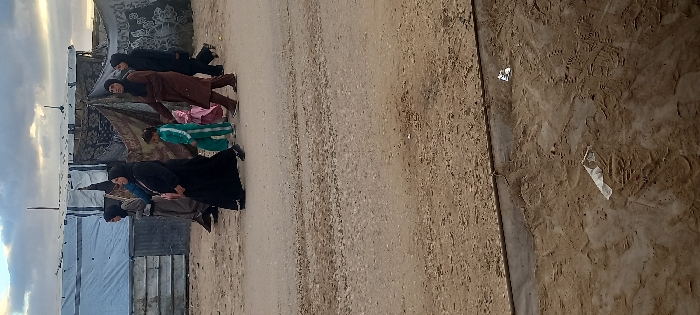- "A group of individuals, presumably women and children, are walking along a dirt path beside a series of makeshift tents or shelters" by FM-INiU52, licensed under CC BY 4.0