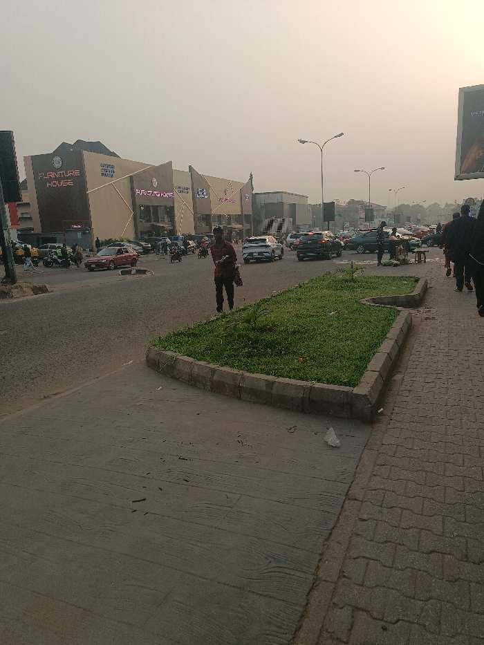A street scene with a patch of green grass bordered by concrete in the foreground. Beyond the grass, a road with moderate traffic, including cars and motorcycles. Several buildings are visible, including one prominently labeled "FURNITURE HOUSE" in large, stylized letters. The sky is overcast, creating a muted light across the scene. Pedestrians are walking along the sidewalk.