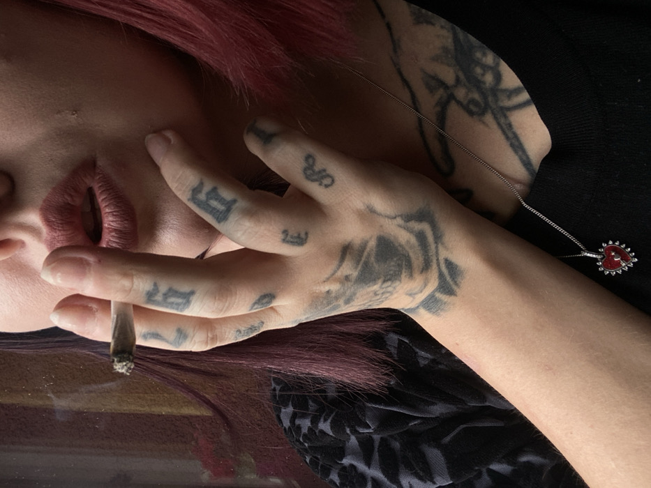 A close-up image, captured in Kunje, Montenegro, shows the upper torso of an individual. The subject has reddish-purple hair framing their face, with their mouth slightly open, revealing lips accented by brownish-pink lipstick. The individual's right hand, heavily tattooed with individual letters on the fingers and a faded design on the back, holds a lit cigarette or joint between the index and middle fingers, positioned near the mouth. Healed scar tissue is visible on the inner forearm. The person is wearing a dark-colored top, with a patterned, possibly velvet, fabric visible on the left shoulder. A silver chain necklace with a red, heart-shaped pendant, outlined with clear stones and featuring a silver key or arrow design, rests on the chest. Faint tattoos are also present on the neck and upper chest area. The background is dark, blurred, and features indistinct reddish-brown hues with a subtle vertical light reflection on the left.