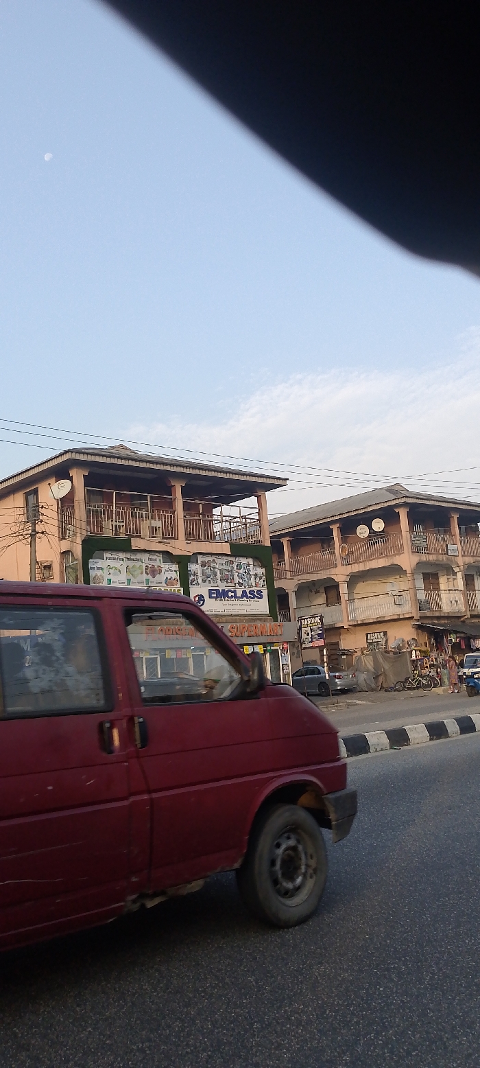 Two-story buildings dominate the scene with visible balconies and satellite dishes. Shops like "Emclass" and "Godsgrace Supermart" are displayed on the storefronts. A red van is prominently positioned in the foreground, obscuring some of the street view. The sky is light blue with some clouds, and what appears to be the moon is visible in the distance. A black and white striped curb is on the edge of the road.