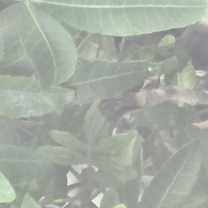 The scene, located in Kiryat Bialik, Israel, presents an extremely blurred and indistinct view dominated by green foliage. Numerous muted green leaves are visible, heavily obscuring any potential background elements. Indistinct brown and dark grey shapes within the foliage suggest branches or other partially visible organic matter. No identifiable persons, animals, or man-made objects are present, nor are any actions or interactions discernible. The image quality is poor, characterized by severe blur and lack of sharp detail, precluding specific identification of any elements beyond general vegetation within an outdoor environment.