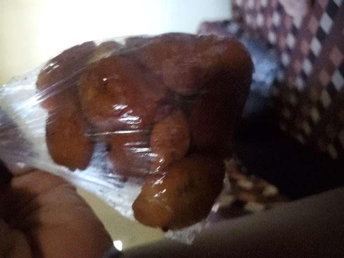 A close-up image, set in Minna, Nigeria, displays a human hand, dark-skinned, holding a clear plastic bag. The bag contains approximately 8-10 irregularly shaped, deep-fried food items, golden-brown to reddish-orange in color, with a visible oily sheen. The items are spherical to ovoid, consistent with traditional Nigerian snacks. The hand grips the gathered top portion of the plastic bag. The background is out of focus, revealing a patterned surface to the lower right, possibly a textile, featuring a grid or checkerboard design in shades of dark brown, reddish-brown, and off-white. The upper background is a diffused, light-colored blur, suggesting an indoor environment. No other individuals are discernible.