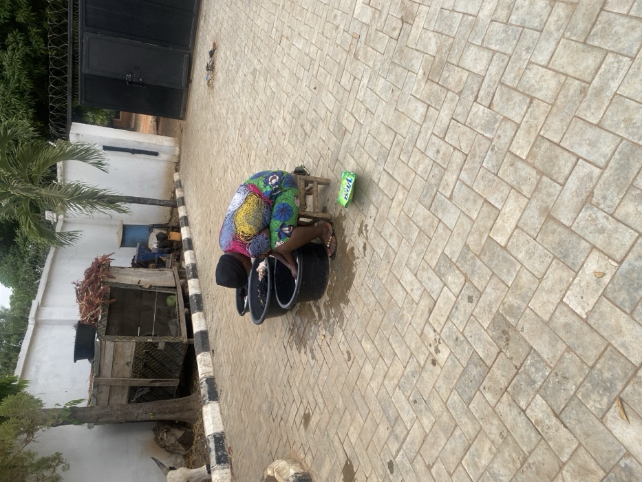 An adult female is depicted in an outdoor paved area in the city of Nakuse, Nigeria. She is seated on a small wooden stool, bent over two black plastic basins on the ground. Her hands are submerged in the front basin, which contains dark material. She wears a dark headscarf, a multicolored long-sleeved top, a green patterned skirt, and light sandals. A green package, partially labeled "VIVA," lies on the grey herringbone-patterned interlocking brick pavement to her right. In the background, a white concrete wall topped with barbed wire runs across the scene. To the left, against the wall, stands a wooden structure with a roof of dried vegetation, and a partially visible white bovine animal. To the right, a dark metal double gate is visible, with a palm tree and green foliage beyond the wall. The pavement has scattered wet spots and minor debris.