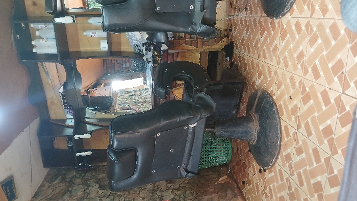 The image displays the interior of a barbershop or hair salon in Kisii, Kenya