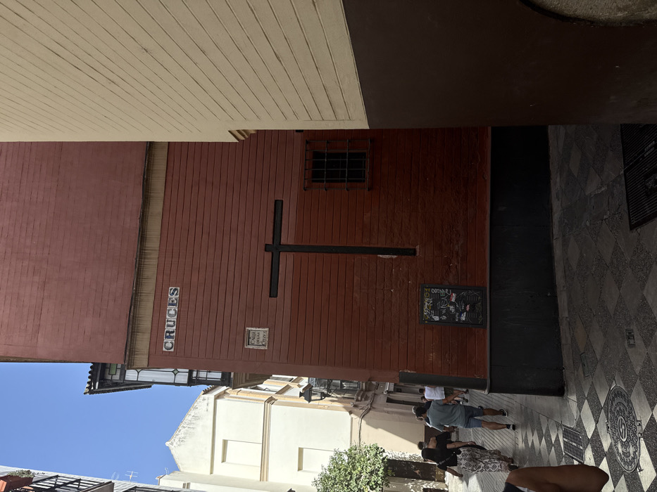 The image depicts a narrow street in Seville, Spain, identified as Calle Cruces by white tiled street signs on a building. The central subject is a reddish-brown, two-story corner building occupying the right and center of the frame. This building features horizontal ridged siding on its lower portion, a dark gray/black base, and a smooth upper section. A large, dark, metallic Latin cross is affixed vertically to the lower wall, to the right of which is a small, barred window with dark grates. Below the cross, a black chalk-style signboard displaying white text and illustrations is mounted on the wall. To the far right, a light beige building wall with a dark brown base partially obstructs the view. On the left side of the frame, a group of approximately five to seven individuals is walking away from the viewer down a cobblestone street. The pavement in the foreground features a black and white checkered pattern, transitioning to irregular gray pavers further down. Two circular metal manhole covers are visible on the ground. A black metal street lamp is attached to a building further along the street. The pedestrians are dressed in casual summer clothing, including shorts and t-shirts. Buildings lining the street on the left are primarily white and light beige, some featuring balconies. A small green tree is visible on the far left. A bright, clear blue sky is visible above the buildings, indicating a sunny day.