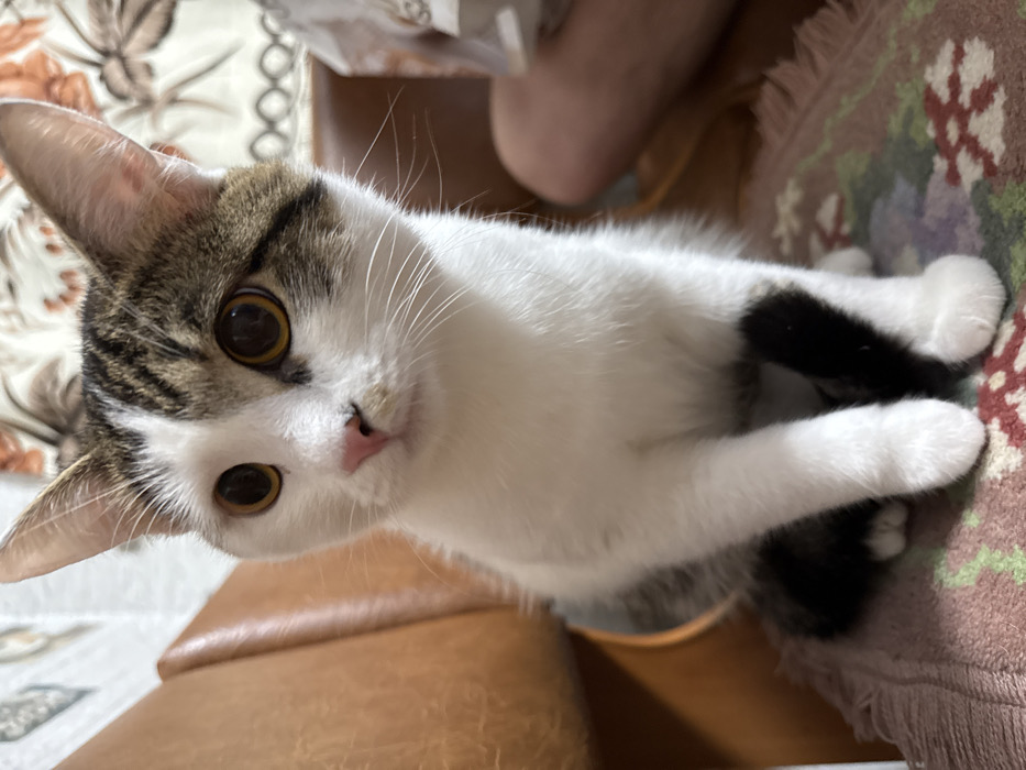 A close-up captures a white and brown tabby cat tilted towards the viewer. The cat has large, bright eyes and a pink nose. It is resting on a brown leather chair and a patterned rug. The cat’s paws are visible, some with black markings. The background shows a patterned surface and a human leg. The overall impression is one of curious engagement.