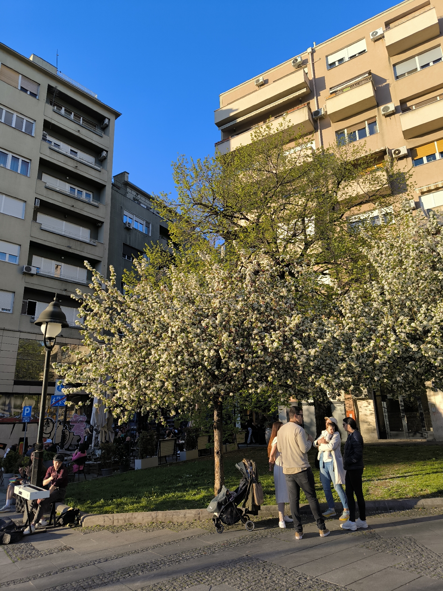 The image captures a vibrant public scene in Belgrade, Serbia, framed by urban architecture and blooming trees