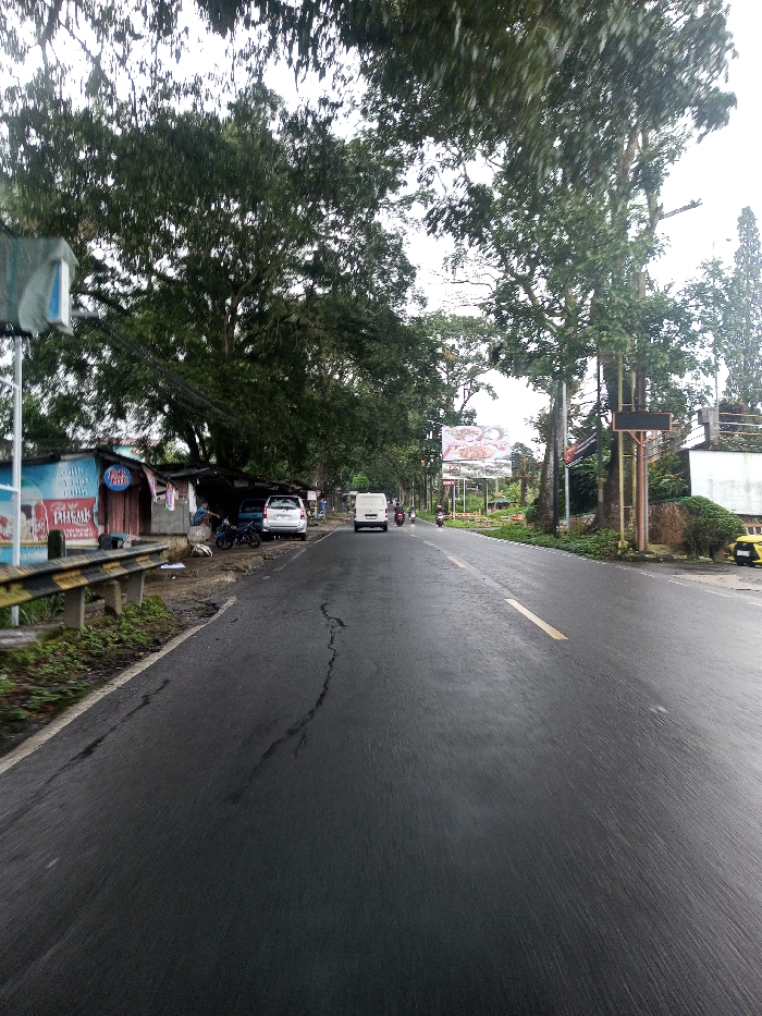 The image depicts a street scene in Serpang Shalli, Bhutan, under an overcast sky. A two-lane asphalt road, visibly wet and exhibiting cracks in the foreground, extends into the distance, marked by a yellow dashed line. To the left, a black and yellow striped guardrail borders a dirt shoulder with green vegetation. Behind this, a series of informal, single-story commercial structures with varied facades (blue, brown, red) are visible. A white car and two motorcycles are parked on the shoulder adjacent to these structures. One partially visible individual is positioned near the parked vehicles. Large trees with dense green foliage line both sides of the road, creating a partial canopy. On the right side of the road, a prominent billboard displaying food items is present, supported by a pole, alongside other utility poles. A white van and several motorcycles are observed traveling away from the viewer on the wet road surface.
