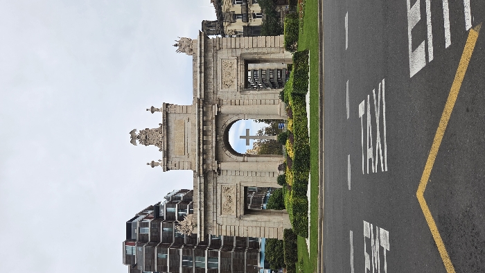 The image depicts the Puerta del Mar (Gate of the Sea) in Valencia, Spain, viewed from the southwest. This architectural monument is situated on a traffic island at the intersection of Glorieta de la Puerta del Mar, Carrer de Colón, and Carrer del General Palanca. In the foreground, the lower quarter of the image shows dark asphalt road with faded white horizontal road markings and a solid yellow chevron pointing towards the bottom center. A green grass verge and manicured hedges, arranged in geometric patterns with white decorative stones, separate the road from the monument. The central subject is the Puerta del Mar, a large, ornate neo-Baroque triumphal arch constructed from light-colored stone. It features a central arched opening flanked by two smaller, rectangular passageways. The structure is adorned with pilasters, decorative reliefs, and an inscribed plaque above the main arch. The apex displays a central escutcheon surmounted by a sculpted eagle with spread wings, flanked by two urn-like finials. Two additional urn-like finials are positioned at the outer upper corners of the structure. Through the central archway, a large, white Latin cross is prominently visible against a lighter sky, indicating its position further back within the Glorieta gardens. This is the Cruz del Salva. To the left of the arch, a modern, multi-story building with a dark-paneled facade and numerous balconies rises against the sky. To the right, an older, multi-story building with traditional architecture and balconies is partially visible behind the monument. The sky above is uniformly overcast, a light grey-white. No individuals are visible in the scene.