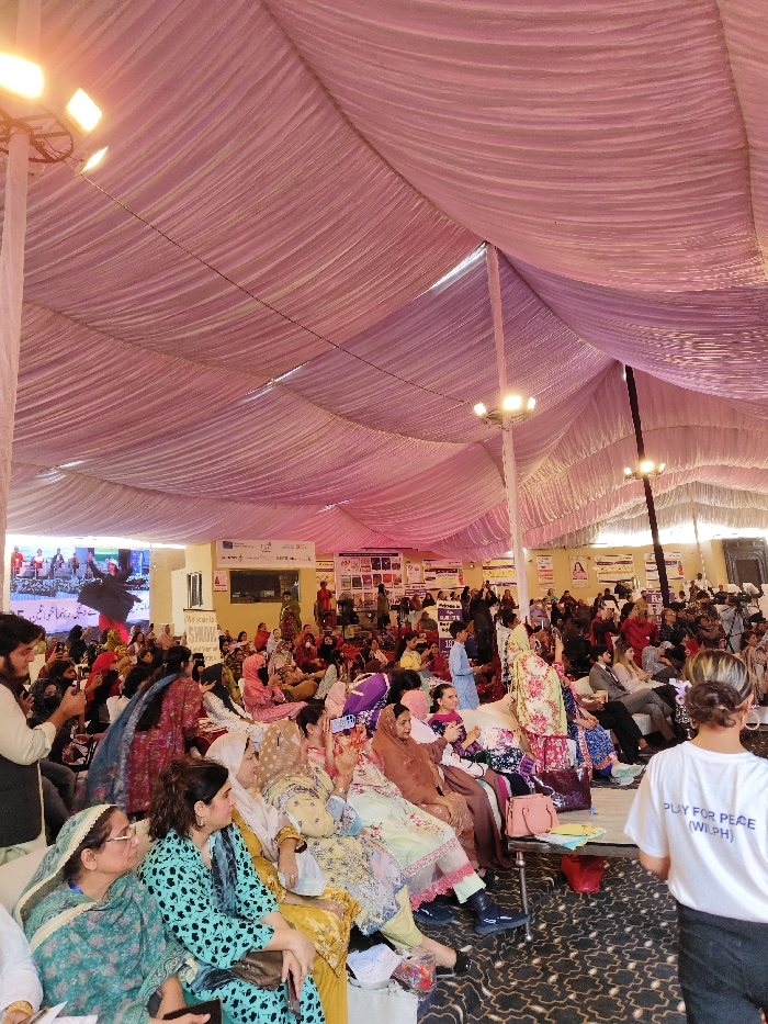 The image displays a large indoor gathering occurring within a temporary event tent, located in Islamabad, Pakistan. The tent's ceiling is draped with light pink/off-white fabric, supported by multiple poles that feature bright, multi-directional lighting fixtures. The floor is covered with a dark patterned carpet or rug, exhibiting a repetitive, abstract design. A substantial crowd, primarily composed of women dressed in diverse traditional Pakistani attire, occupies the space. Many individuals are seated on the patterned floor, some utilizing cushions or low seating. Several attendees are observed holding mobile phones, seemingly recording or photographing the event. In the immediate foreground right, a woman is viewed from behind, wearing a white t-shirt with "PLAY FOR PEACE (WLPH)" printed in blue text. To the foreground left, a man with a beard is visible, also holding a mobile phone. In the background, a large LED screen displays an image of a performer in red and black attire, possibly a whirling dervish, with Urdu text visible below. Adjacent to the screen, various banners and posters with text and logos are affixed to a wall, suggesting event information or sponsors. Additional individuals, including some seated on chairs and children, are present further back within the tent structure. The overall scene depicts an audience attentively observing a presentation, performance, or conference.