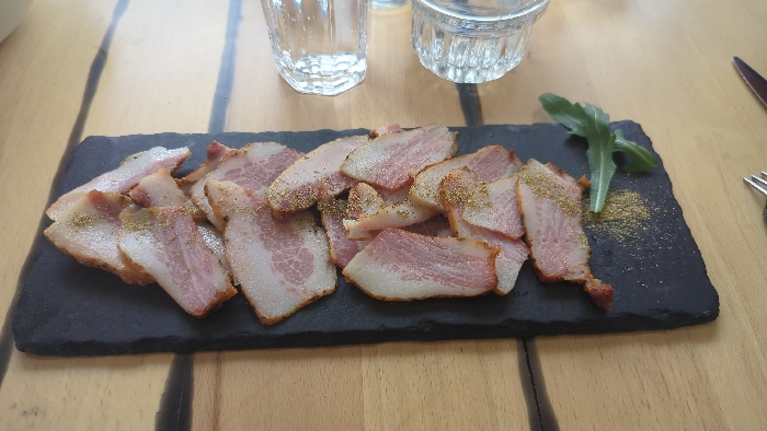 - "A still life image captures a serving of sliced cured meat on a black rectangular slate platter, situated on a light brown wooden table in Slokoshtitsa, Bulgaria" by FM-Emas82, licensed under CC BY 4.0