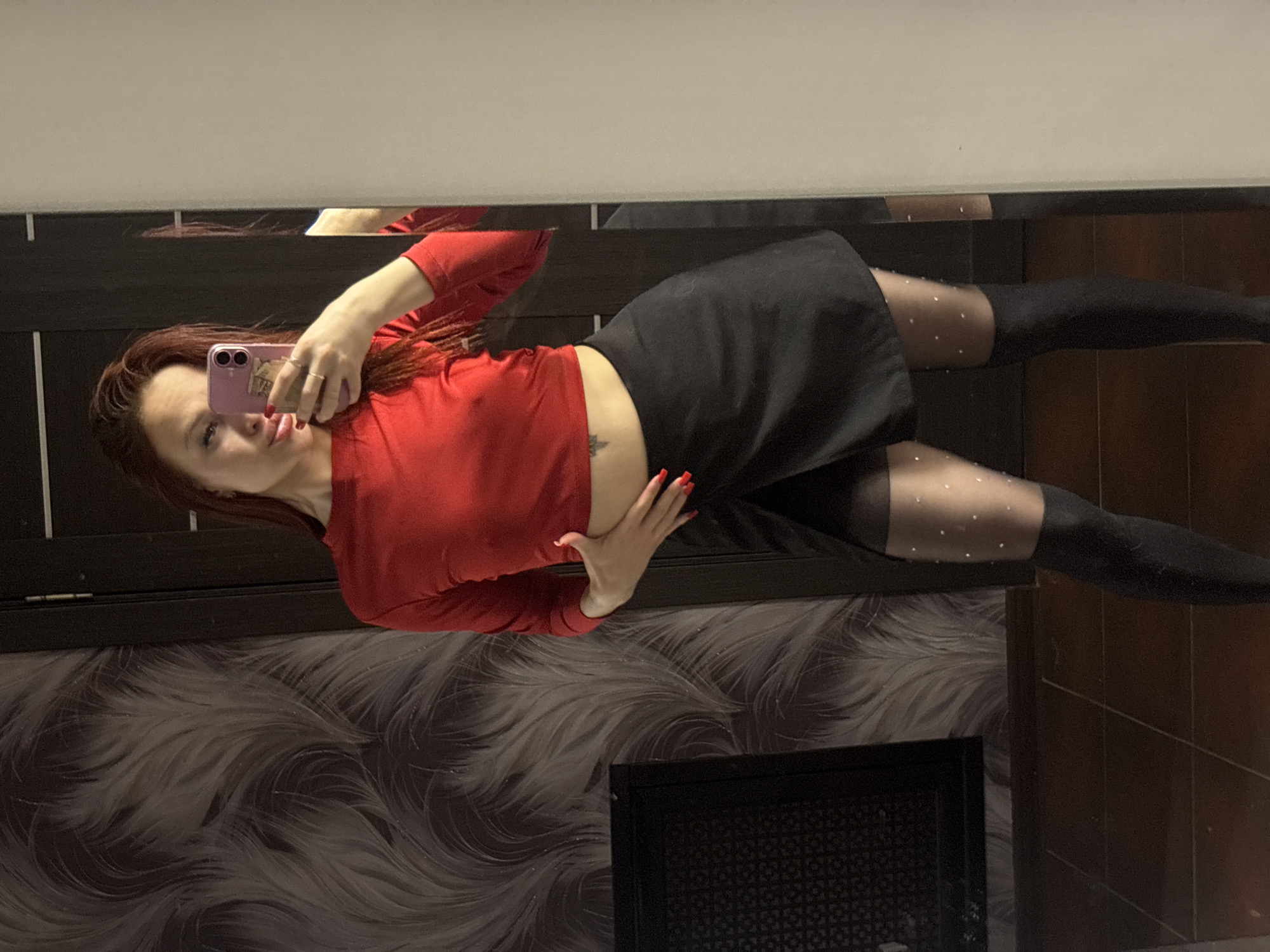 A woman with long red hair is taking a selfie in a mirror. She is wearing a red long-sleeved top, a black skirt, and black tights with small white polka dots. She is holding a pink phone in her left hand. She has red nail polish. A small tattoo is visible on her abdomen. The background includes a wall with a wavy pattern, a dark brown door, and brown tiles. The location cannot be determined from the image.