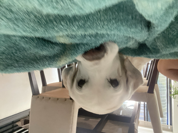 The image presents an indoor scene featuring a cream-colored dog, consistent with a Golden Retriever or similar breed, positioned in the foreground. The dog's head is lowered, with its muzzle resting on or near a teal-colored, shaggy blanket or rug that occupies the immediate foreground. The dog is looking directly into the lens. A partial human limb, likely an arm or leg, is visible on the far left side of the frame. In the background, two upholstered dining chairs with light-colored fabric seats and dark wooden legs are visible, partially obscured by a dark-colored table. Ambient natural light illuminates the scene, originating from a window or glass door visible in the background, through which faint greenery can be discerned. The specific location within Coatzacoalcos, Mexico, cannot be determined from the visual information provided in the image.