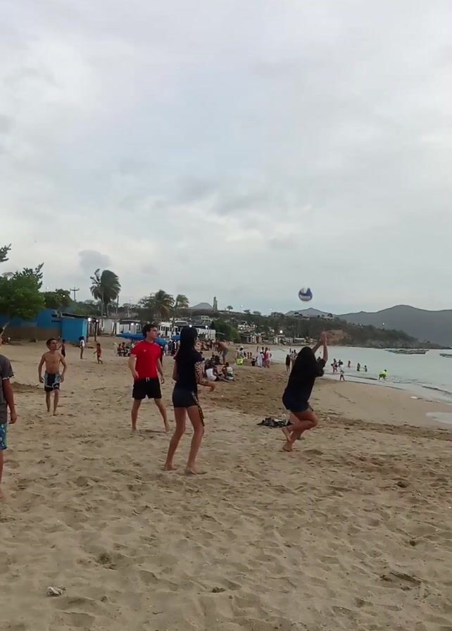 The scene is a wide shot of a beach with many people enjoying a cloudy day. In the foreground, a group of about 7-8 people are playing volleyball on the sand. The players consist of children and adults, all dressed casually in beach attire. The volleyball floats in the air, a few people attempt to strike it, a few others run in anticipation of its trajectory. Behind them is a wider sandy beach area with several other people lounging, walking and interacting. Further in the background, there's a view of calm water with a couple of boats anchored offshore, a line of buildings and trees. The sky is overcast, suggesting a mild weather. The overall atmosphere of the video appears to be one of relaxed leisure and outdoor activity.