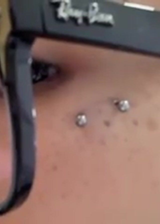 close-up shot of a person's face, partially obscured by black Ray-Ban glasses. The person has freckles and multiple piercings. There is a piercing on the side of the nose and two piercings clustered together near the outer corner of the eye, on the cheek. The background appears to be a plain, light-colored wall.