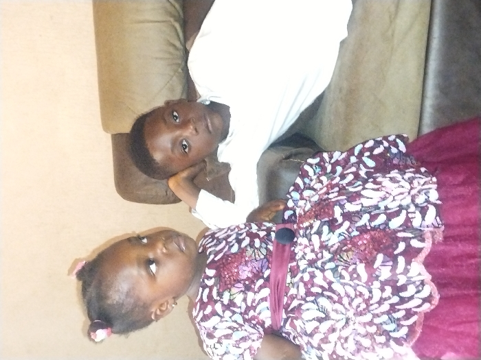 The image displays two children indoors, in what appears to be a residential setting located in New Stadium, Nigeria