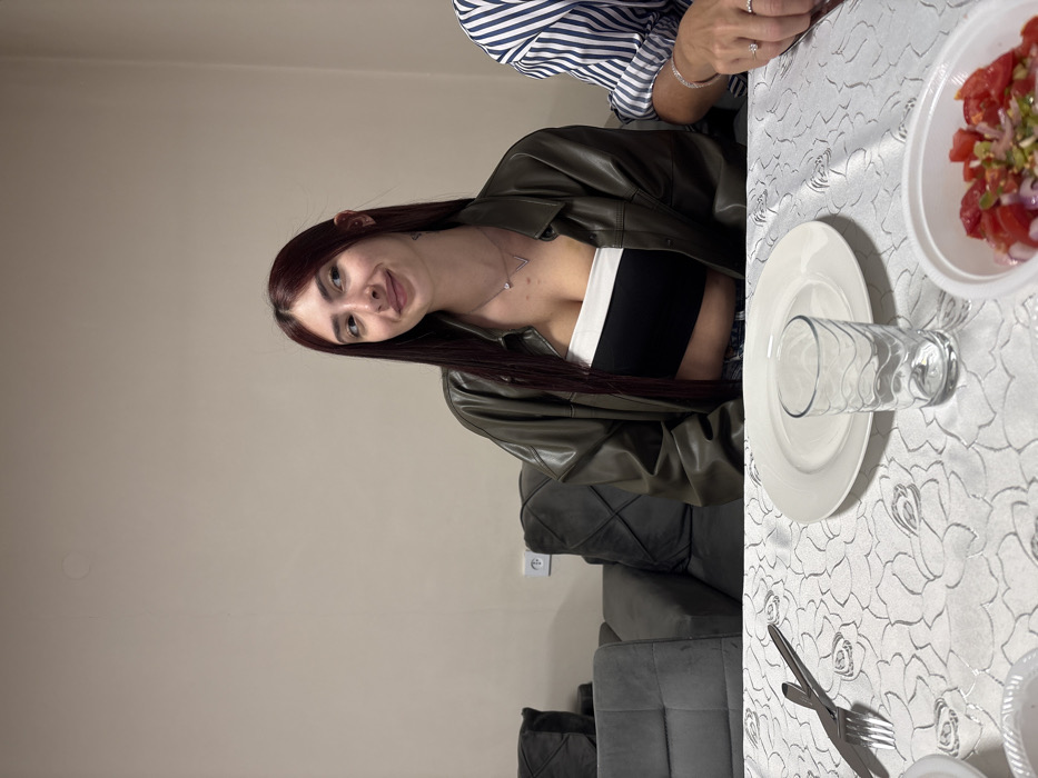 The image depicts an indoor scene in Petah Tikva, Israel, likely a residence, with a young adult female seated at a dining table