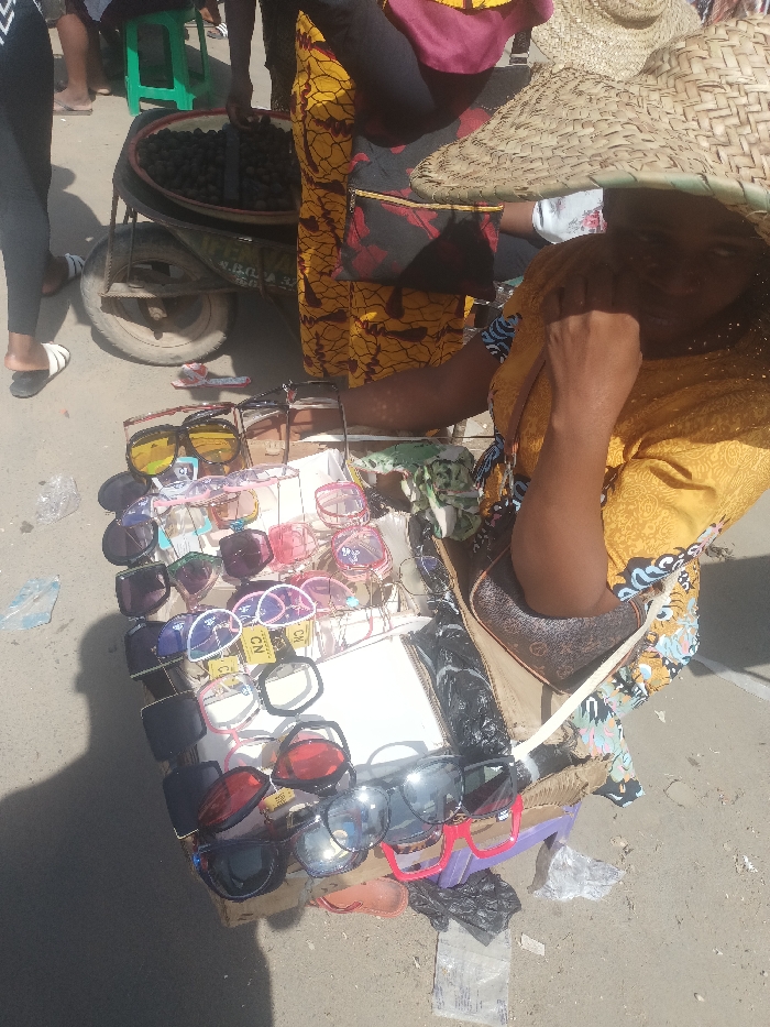 This image depicts an outdoor market scene in Unguwar Kaya, Nigeria. A street vendor, partially visible on the right, wears a straw hat and a yellow patterned garment. She is seated or kneeling behind a display stand constructed from cardboard boxes, presenting a wide array of sunglasses. The sunglasses, varying in frame style, lens color, and size (including aviator, cat-eye, and rectangular designs), are neatly arranged on wire racks within the boxes; some retain yellow price tags. A brown patterned shoulder bag hangs over the side of the display. In the background, a two-wheeled pushcart with a large metal basin filled with dark, round produce (possibly African black plums or similar fruit) is visible. Several other individuals are partially visible in the background, indicated by their legs and feet; one person wears black leggings and white slide sandals near a green stool. The ground is a light-colored, unpaved or worn concrete surface, littered with plastic bags and paper debris. Strong sunlight illuminates the scene, casting distinct shadows.