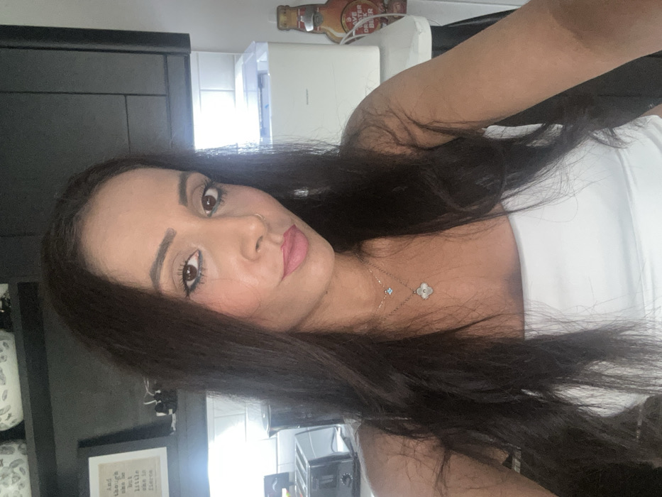 The image depicts a woman with long, dark hair and light brown skin, presenting a direct gaze into the camera with a slight smile