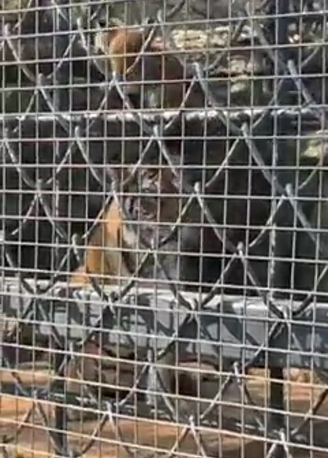 tiger standing in a cage at what appears to be a zoo or wildlife sanctuary