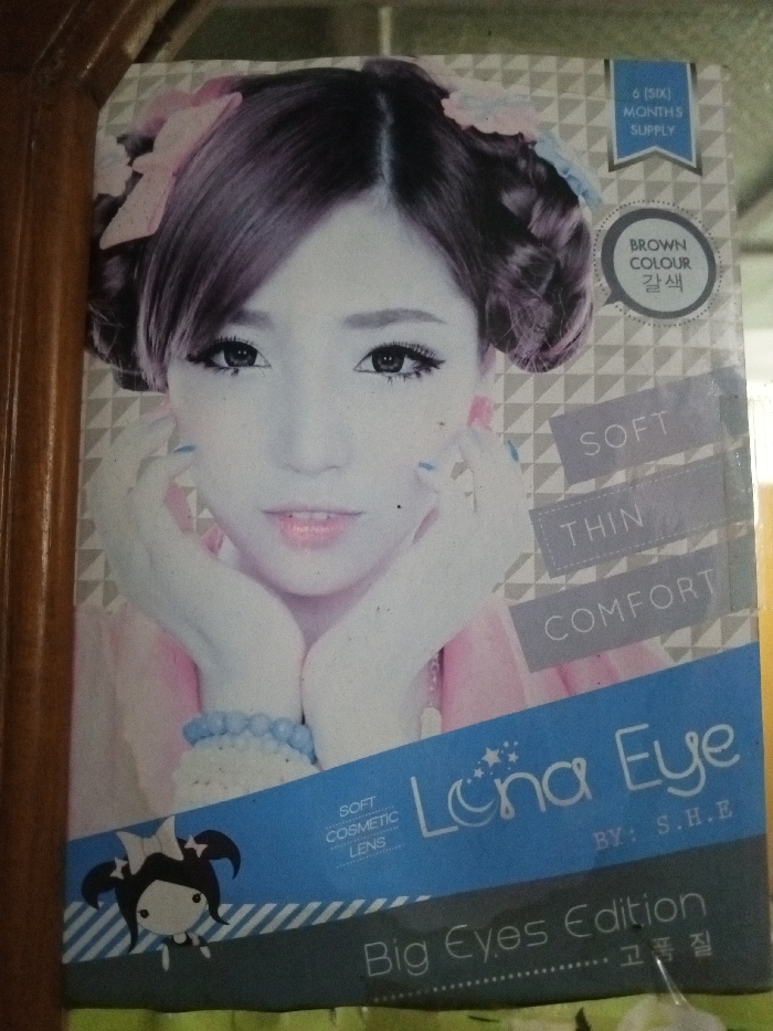 This image depicts a close-up photograph of a consumer product package, located in Keo Kouang, Laos. The primary subject is a rectangular box or display card for "Lena Eye" soft cosmetic contact lenses, specifically the "Big Eyes Edition" in "BROWN COLOUR." The packaging specifies a "6 (SIX) MONTHS SUPPLY" and describes the lenses as "SOFT, THIN, COMFORT." The front of the package features a portrait of a young East Asian female model. She is looking directly forward, with dark hair styled into two prominent buns or coils, adorned with light pink bows. Her eyes are accentuated with dark eyeliner and appear to be enhanced by dark brown or black cosmetic contact lenses. Her lips are slightly parted, colored with light pink lipstick. Her hands are positioned beneath her chin, showcasing light blue nail polish on her fingernails and a light blue beaded bracelet on her left wrist. She wears a light-colored garment, possibly pink. The background of the package artwork is a light gray and white geometric pattern. A prominent blue band crosses the lower section of the package, displaying the brand name "Lena Eye" with a stylized crescent moon and stars, and the text "BY: S.H.E." A cartoon character, depicting a girl with pigtails and a bow, is positioned on the lower-left of this blue band. Additional text in Korean, "갈색" (brown color) and "고품질" (high quality), is present. The photograph itself captures the package partially framed on its left and top-left by a vertical, light brown wooden surface, exhibiting visible wood grain. The right and bottom edges of the image reveal glare and a slightly blurred, lighter background, consistent with an indoor environment. The package exhibits minor surface imperfections or dust.