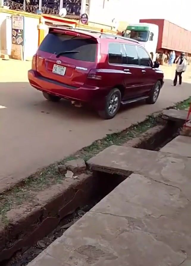 red Toyota Highlander parked on the side of a road in what appears to be a residential or commercial area. A large white truck with a brown trailer is parked across the road. A person is walking on the opposite side of the road, behind the truck. The road has a ditch running along its edge with concrete slabs. A building with white walls and a dark roof can be seen in the background. The video seems to have been taken from a static viewpoint at street level.