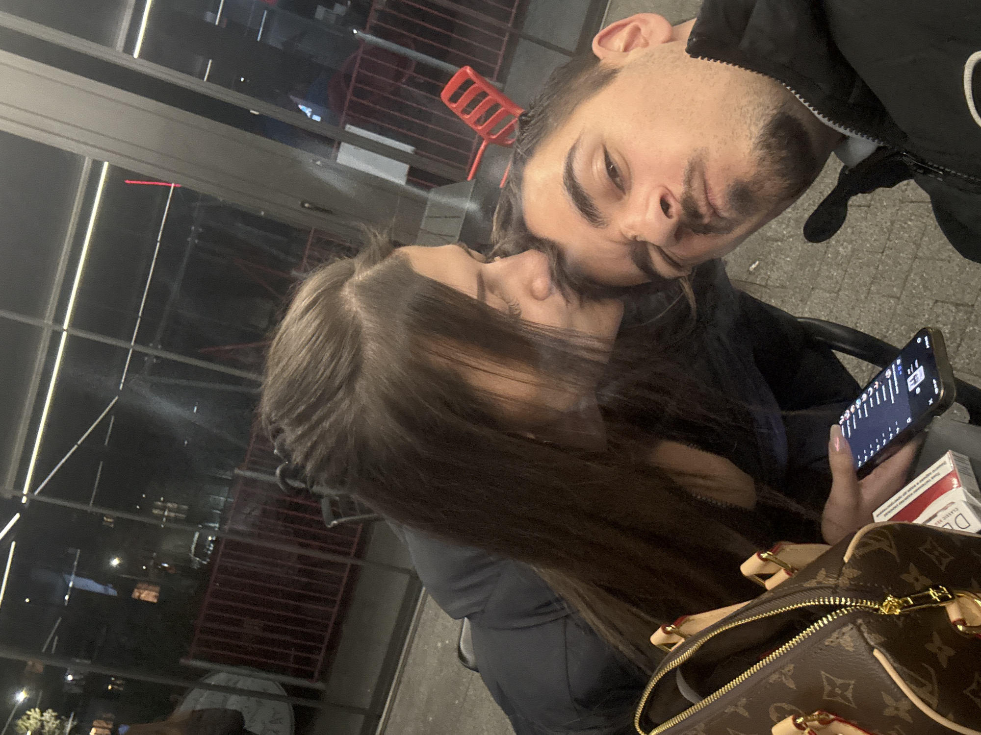 A couple poses for a selfie in an urban environment. The man, with short dark hair and a trimmed beard, is turned towards the camera. A red comb is partially visible in his hair. The woman, with long dark hair, holds a mobile phone in her right hand. A pack of cigarettes rests beside the phone. A Louis Vuitton handbag is visible in the lower right corner. The background shows a building with visible steel beams and lights, suggesting an outdoor setting in Sofia, Bulgaria. The image appears to be taken at night.